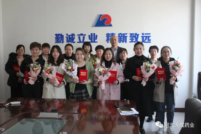 3月8日上午,河北天成藥業(yè)開展“風華時代女性,共建美麗天成“三●八"紅旗手頒獎活動。公司黨總.支副書記、工會主席王頤為接受表彰的17位先進個人頒發(fā)“三●八"紅旗手證書、鮮花和獎品。
