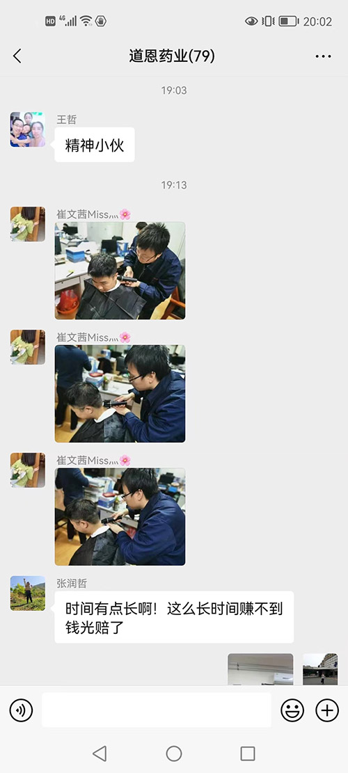 這兩天道恩藥業(yè)工作群里被一段段理發(fā)的視頻和搞笑的評論刷屏了。視頻里的“理發(fā)師”是道恩藥業(yè)生產(chǎn)總監(jiān)王學(xué)智,他拿著電動推子全神貫注為員工理發(fā),每一下都十分認真,不放過任何一個細節(jié);被理發(fā)的“頹廢少年”秒變“精神小伙”;圍觀群眾打趣到:“服務(wù)這么長時間卻賺不到錢,光賠了。”理發(fā)現(xiàn)場的氣氛十分融洽,隔著屏幕都能讓我們感受到那份歡快。