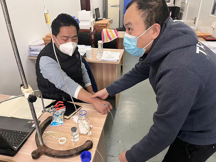 “哪位同事會輸液?”一聲令下孫江挺身而出來到三廠給王潤偉輸液扎針。由于第二天孫江工作需要脫不開身,眼看好轉(zhuǎn)的王潤偉沒有人給輸液了,這可怎么辦?我跟王潤偉說我扎過兔子,我敢下手,但是不一定能扎進(jìn)去,你敢嗎?他笑笑說:“你在我這練練就會了。”我拿起輸液器嘗試了兩次仍沒有扎進(jìn)去,緊張的我出了一身汗,抬頭看看王潤偉我十分抱歉的說:“真不好意思,兩針都沒進(jìn)去。”他毫不在意的笑著說:“沒事多扎幾針就行了。”但是在強(qiáng)大的心理壓力下,我不敢再次嘗試。張總又一次緊急尋找能輸液扎針的人,最后找到了只扎過兩次針的道恩化驗(yàn)室微生物組組長呂文杰。呂文杰看看王潤偉的手說:“你這確實(shí)不好扎。”兩針下去又沒有成功。扎過針的人都知道越是扎不中血管疼痛就會越劇烈,王潤偉沒有任何責(zé)備,一直保持著微笑,說到:“咱們換只手扎吧。”又一針下去終于成功了。呂文杰如釋重負(fù),擦了擦頭上的汗對王潤偉豎起了大拇指。
