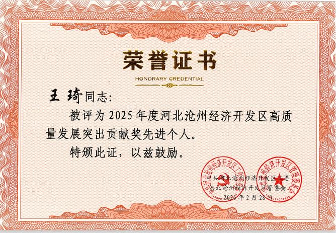 喜報(bào)|王琦榮獲滄州經(jīng)濟(jì)開(kāi)發(fā)區(qū)2025年度高質(zhì)量發(fā)展突出貢獻(xiàn)獎(jiǎng)先進(jìn)個(gè)人