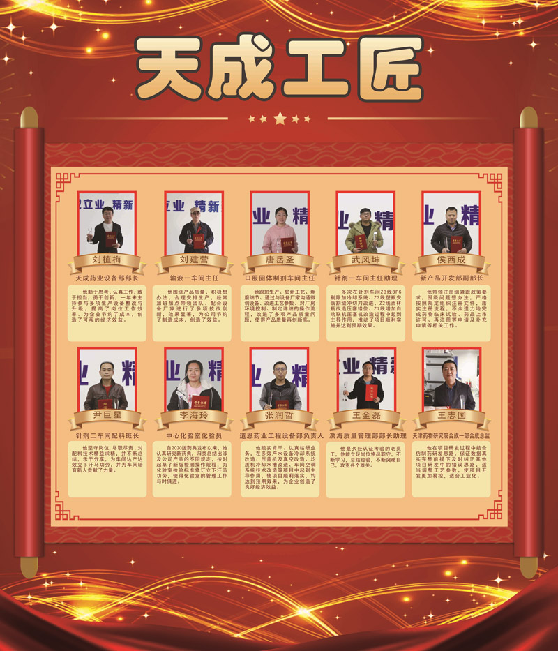 劉植梅:天成藥業(yè)設備部部長,他勤于思考,認真工作,敢于擔當,勇于創(chuàng)新,一年來主持參與多項生產設備整改與升級,提高了崗位工作效率、為企業(yè)節(jié)約了成本,創(chuàng)造了可觀的經濟效益。