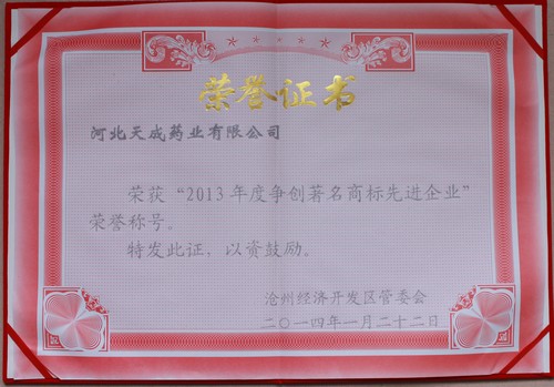 2014年榮獲“2013年度爭創(chuàng)著名商標先進企業(yè)”榮譽稱號
